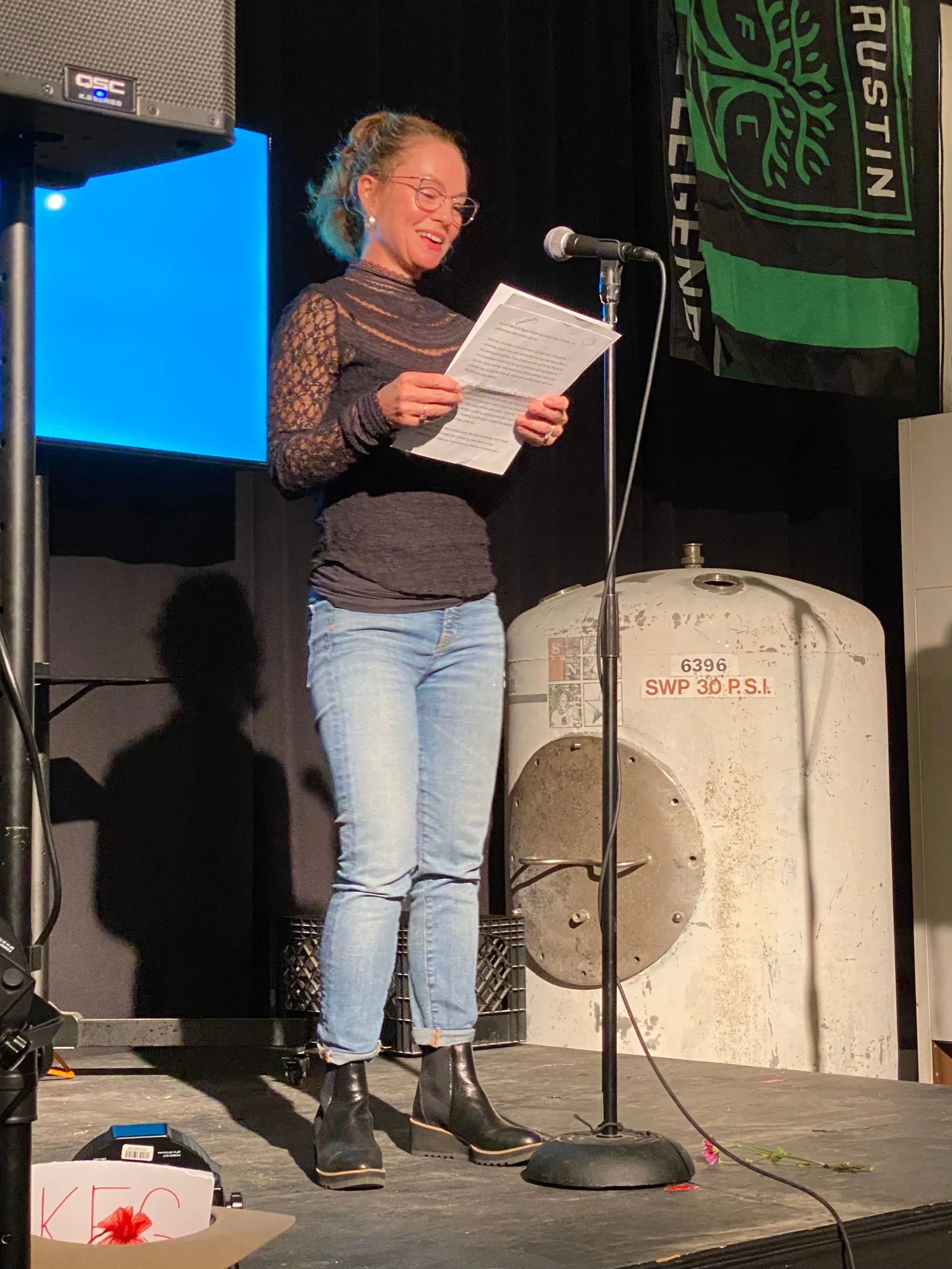 She has also volunteered for CreativeMornings Austin, CommunityFirst, TedX, e4Youth, is a former judge of the O.Henry Pun Off World Championships, and enjoys performing punny hip hop songs, likes sea salt on her sweets and curating solo dance party playlists.